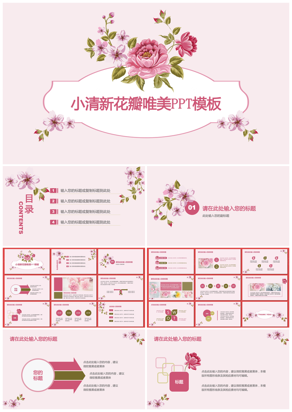 这是一张红色花瓣商务PPT模板,包含红色、小清新、花瓣、唯美、商务等主题内容,也可用作红色小清新花瓣唯美、小清新花瓣唯美商务、花瓣唯美商务通用、红色小清新花瓣、小清新花瓣唯美、花瓣唯美商务、唯美商务通用、红色小清新、小清新花瓣、花瓣唯美、唯美商务、商务通用等PPT场景使用。 风云办公提供的红色花瓣商务PPT模板,下载格式为pptx,一共25页,作品中文字及图均可以修改和编辑,图片更改请在作品中右键图片并更换,文字修改请直接点击文字进行修改。