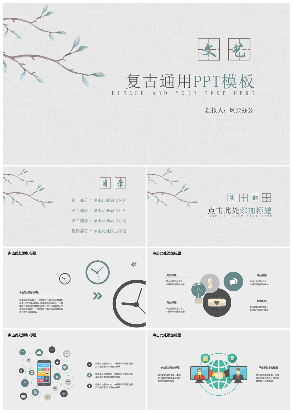 这是一张文艺复古总结汇报通用PPT模板,包含文艺、复古、总结、汇报等主题内容,也可用作文艺、复古、总结、汇报 文艺复古总结汇报、文艺复古总结、文艺复古汇报、文艺总结汇报、复古总结汇报、文艺复古、文艺总结、文艺汇报、复古总结、复古汇报、总结汇报等PPT场景使用。 风云办公提供的文艺复古总结汇报通用PPT模板,下载格式为,一共26页,作品中文字及图均可以修改和编辑,图片更改请在作品中右键图片并更换,文字修改请直接点击文字进行修改。