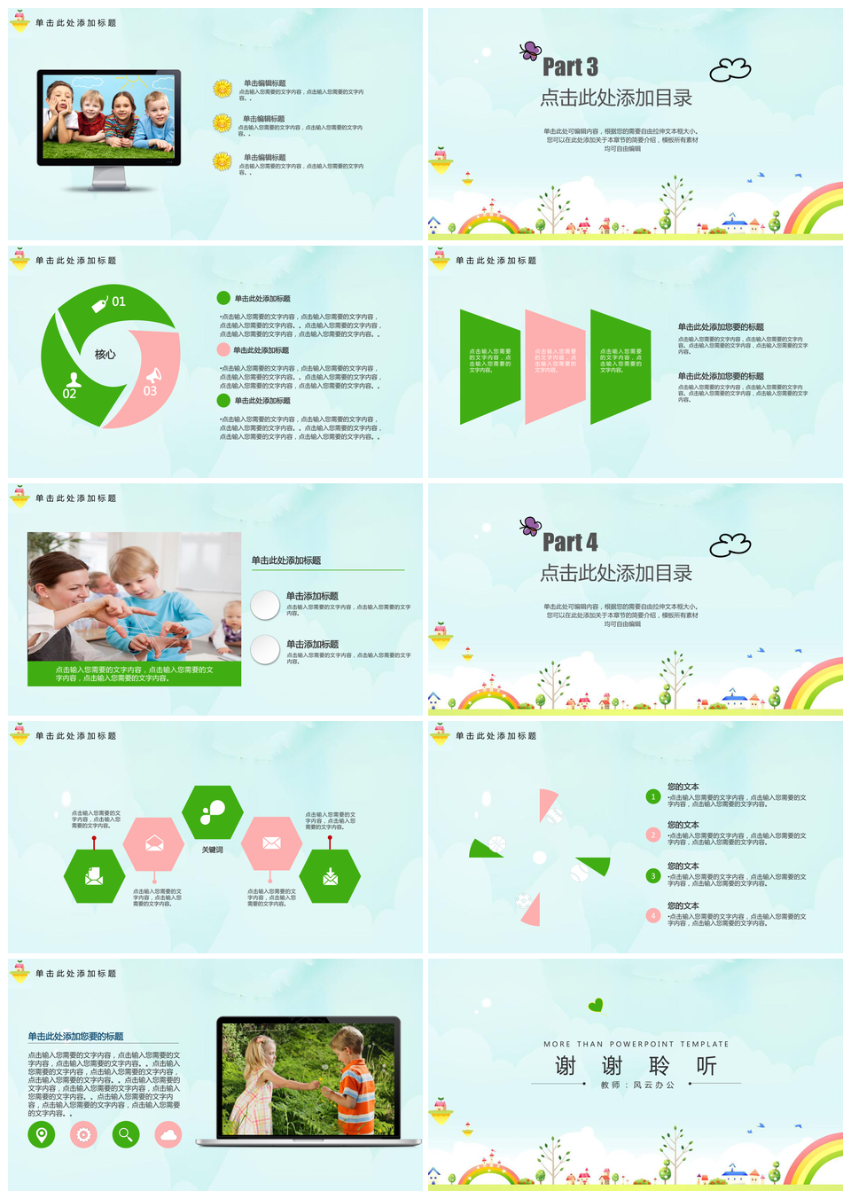 这是一张绿色幼教卡通PPT模板高质量,包含绿色、超清爽、卡通、幼教等主题内容,也可用作绿色超清爽卡通幼教、超清爽卡通幼教、清爽卡通幼教、绿色卡通幼教、绿色清爽卡通、卡通幼教、绿色幼教、清爽卡通、绿色清爽、清爽幼教等PPT场景使用。 风云办公提供的绿色幼教卡通PPT模板高质量,下载格式为pptx,一共17页,作品中文字及图均可以修改和编辑,图片更改请在作品中右键图片并更换,文字修改请直接点击文字进行修改。