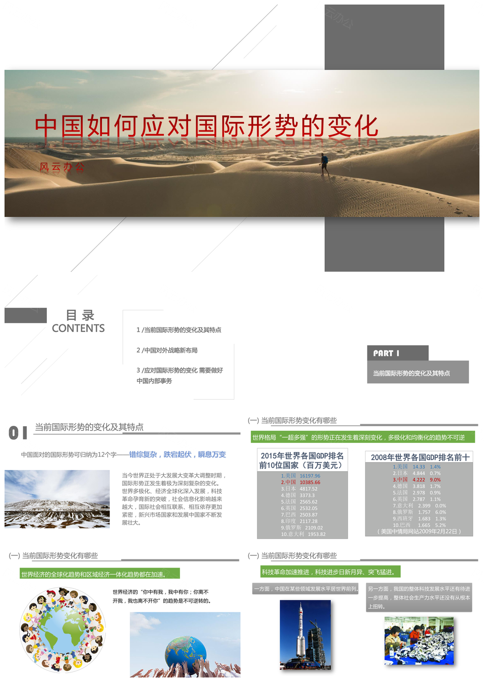 这是一张黄色中国形势分析PPT模板,包含黄色中国、国际形势、变化等主题内容,也可用作黄色中国应对国际形势变化、中国应对国际形势变化、应对国际形势变化、国际形势变化、黄色中国应对国际形势、中国应对国际形势、应对国际形势、国际形势、黄色中国应对、中国应对、应对国际、国际形势变化、形势变化等PPT场景使用。 风云办公提供的黄色中国形势分析PPT模板,下载格式为pptx,一共38页,作品中文字及图均可以修改和编辑,图片更改请在作品中右键图片并更换,文字修改请直接点击文字进行修改。