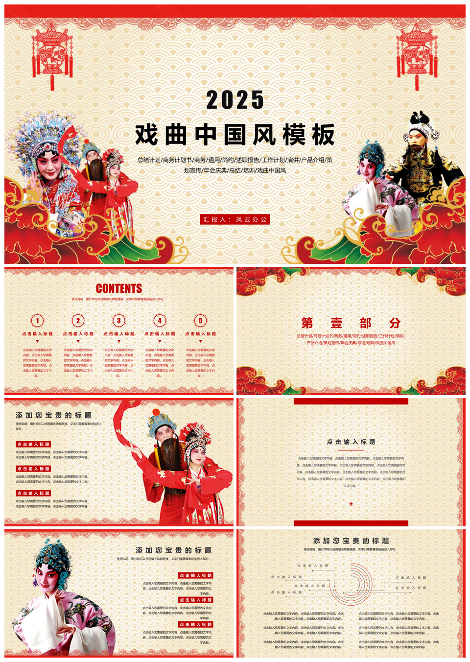 风云办公提供的2025戏曲中国风商务汇报总结PPT模板,下载格式为,一共26页,作品中文字及图均可以修改和编辑,图片更改请在作品中右键图片并更换,文字修改请直接点击文字进行修改。