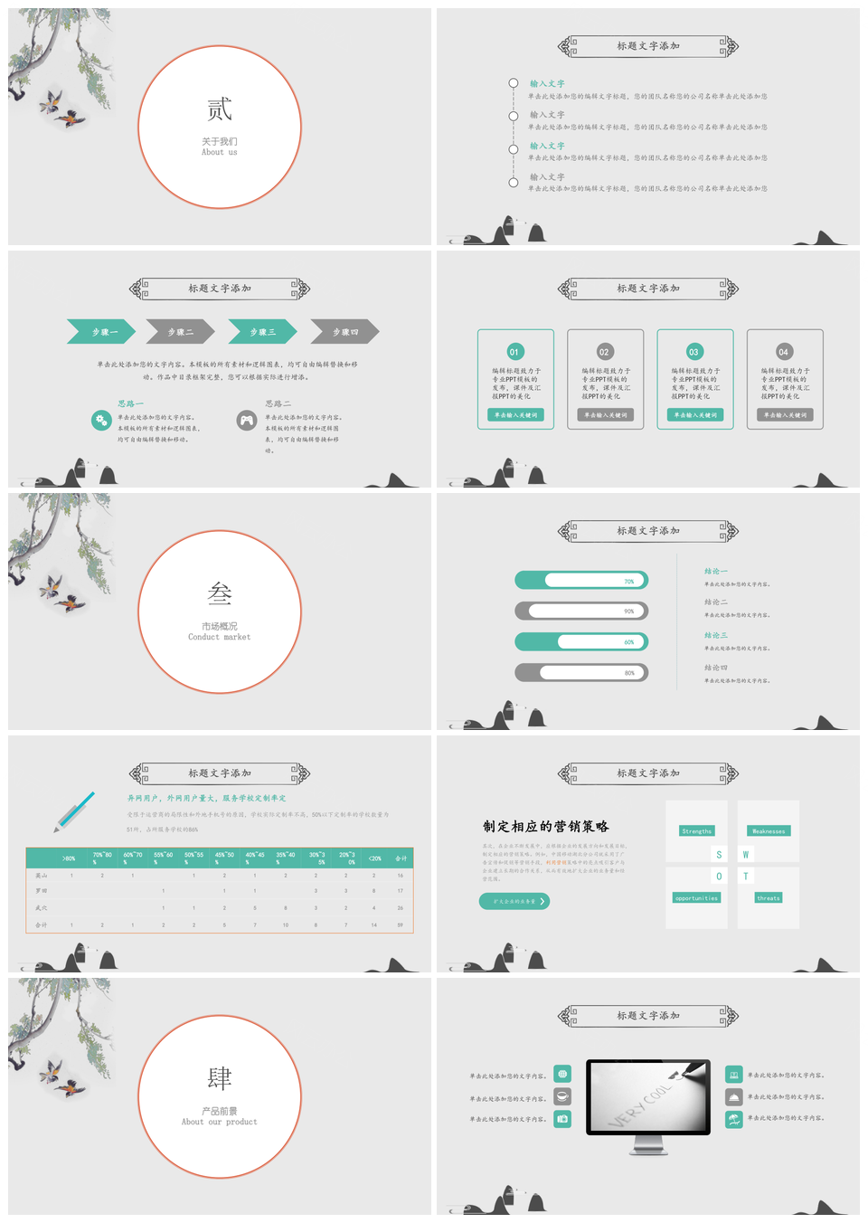 风云办公提供的灰色中国风中式清新汇报总结高端PPT模板,下载格式为pptx,一共21页,作品中文字及图均可以修改和编辑,图片更改请在作品中右键图片并更换,文字修改请直接点击文字进行修改。