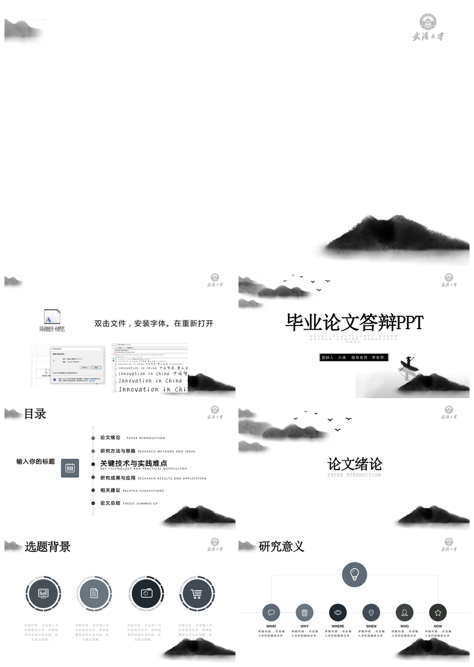 风云办公提供的黑色水墨中国风开题答辩PPT模板精美,下载格式为pptx,一共31页,作品中文字及图均可以修改和编辑,图片更改请在作品中右键图片并更换,文字修改请直接点击文字进行修改。