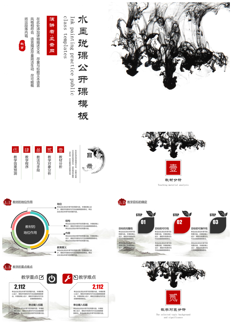 这是一张红色中国风说课PPT模板,包含红色、中国风、说课、公开课等主题内容,也可用作红色中国风说课公开课、中国风说课公开课、红色说课公开课、红色中国风公开课、红色中国风说课、中国风公开课说课、红色公开课说课、中国风红色公开课、红色中国风、中国风说课、红色说课、红色公开课、中国风公开课、说课公开课等PPT场景使用。 风云办公提供的红色中国风说课PPT模板,下载格式为pptx,一共23页,作品中文字及图均可以修改和编辑,图片更改请在作品中右键图片并更换,文字修改请直接点击文字进行修改。