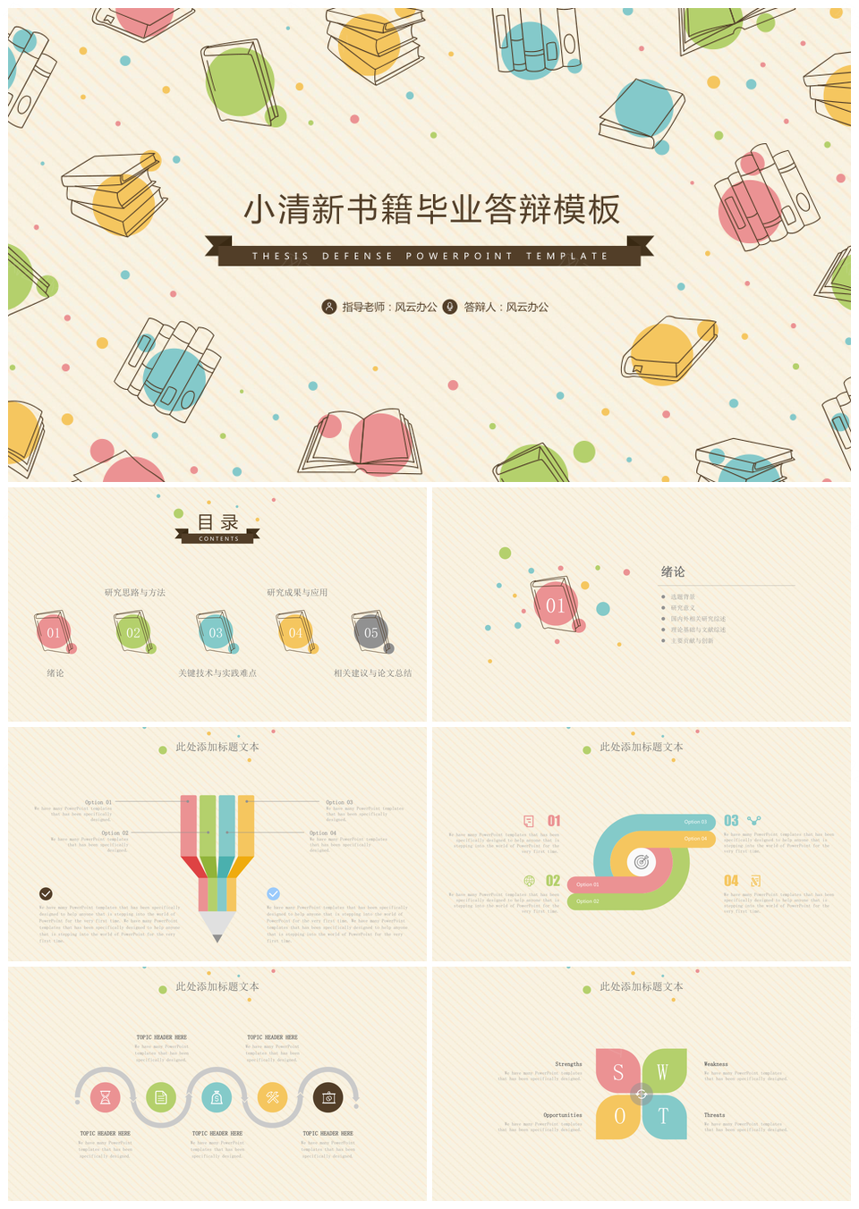 这是一张彩色小清新书籍毕业答辩PPT模板,包含彩色、小清新、书籍、毕业、答辩等主题内容,也可用作小清新书籍毕业答辩、彩色小清新书籍毕业、彩色小清新书籍、小清新书籍毕业、书籍毕业答辩、彩色小清新、小清新书籍、书籍毕业、毕业答辩、彩色书籍等PPT场景使用。 风云办公提供的彩色小清新书籍毕业答辩PPT模板,下载格式为pptx,一共33页,作品中文字及图均可以修改和编辑,图片更改请在作品中右键图片并更换,文字修改请直接点击文字进行修改。