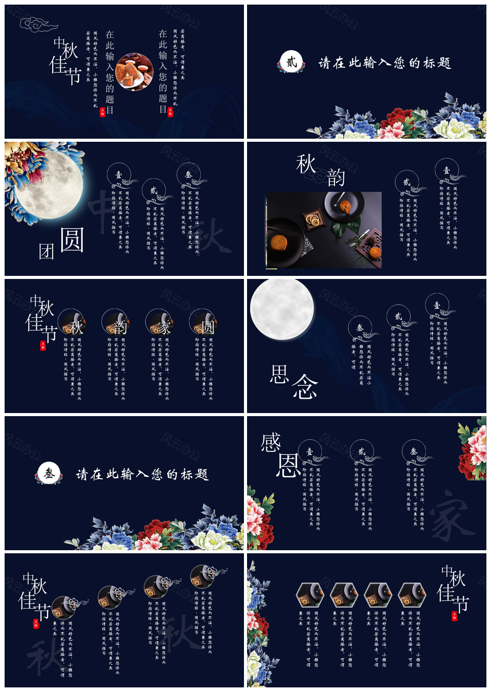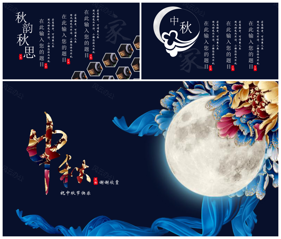 风云办公提供的深蓝色中秋花好月圆中秋节团圆通用PPT模板,下载格式为pptx,一共19页,作品中文字及图均可以修改和编辑,图片更改请在作品中右键图片并更换,文字修改请直接点击文字进行修改。