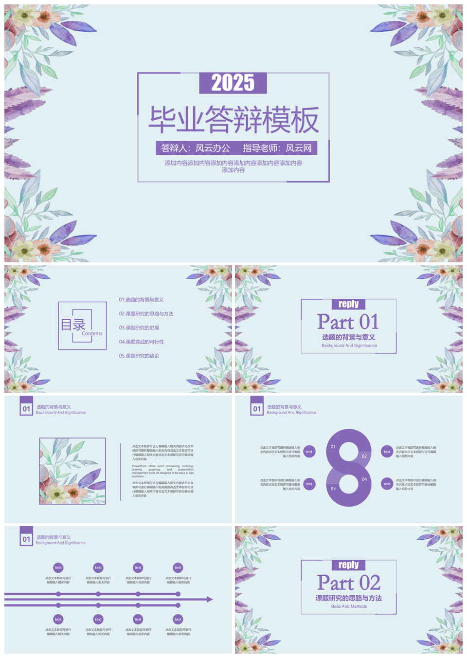 风云办公提供的紫色水彩毕业答辩PPT模板精美,下载格式为pptx,一共20页,作品中文字及图均可以修改和编辑,图片更改请在作品中右键图片并更换,文字修改请直接点击文字进行修改。