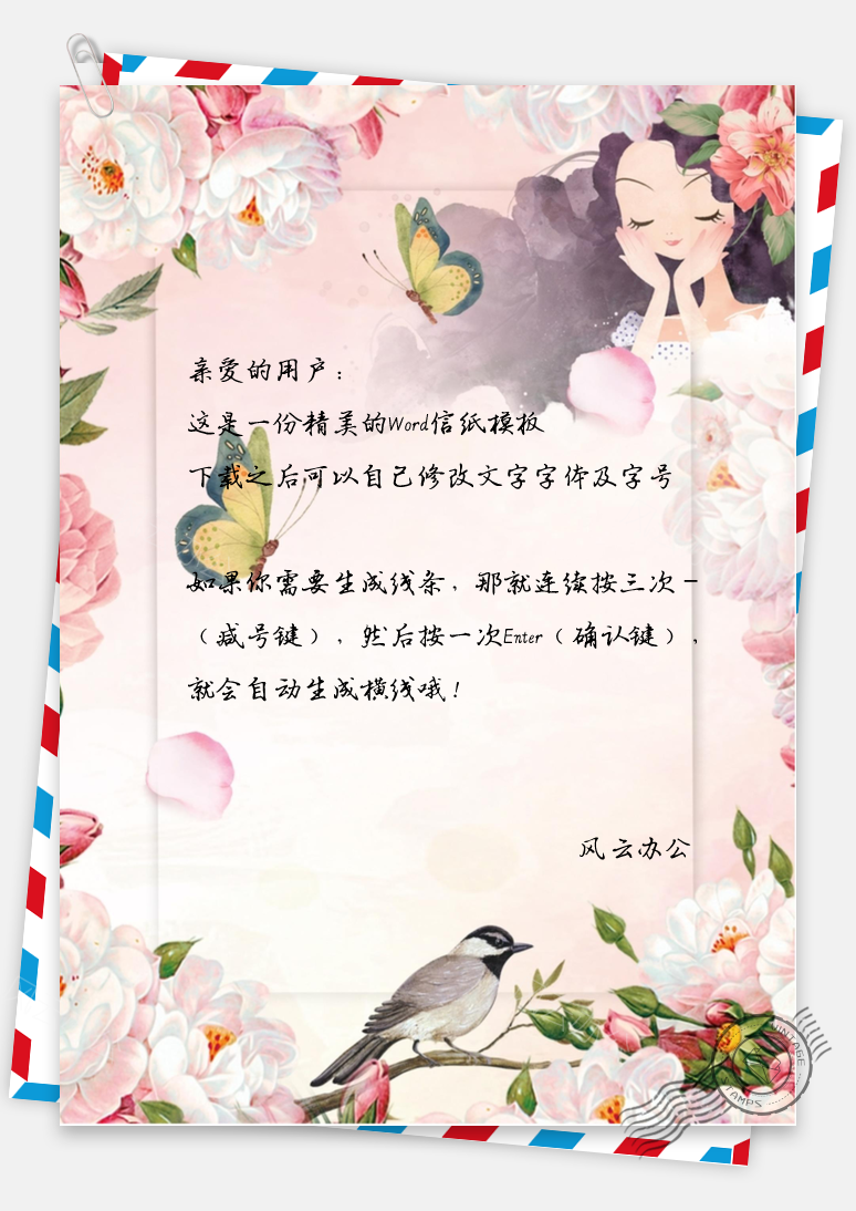 风云办公提供小清新文艺蝴蝶信纸Word模板下载,格式为 docx,一共1页,作品中文字及图均可以修改和编辑,图片更改请在作品中右键图片并更换,文字修改请直接点击文字进行修改。更多精彩信纸Word模板,尽在风云办公。