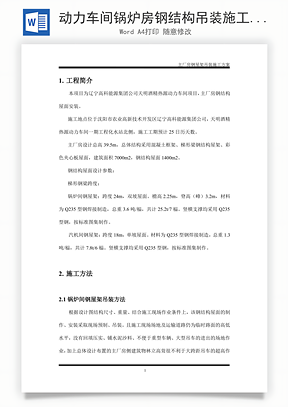 风云办公提供动力车间锅炉房钢结构吊装施工Word模板下载,格式为 word,一共1页,作品中文字及图均可以修改和编辑,图片更改请在作品中右键图片并更换,文字修改请直接点击文字进行修改。更多精彩工程管理Word模板,尽在风云办公。