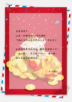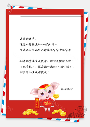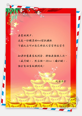 风云办公提供春节金子信纸Word模板下载,格式为 docx,一共1页,作品中文字及图均可以修改和编辑,图片更改请在作品中右键图片并更换,文字修改请直接点击文字进行修改。更多精彩信纸Word模板,尽在风云办公。