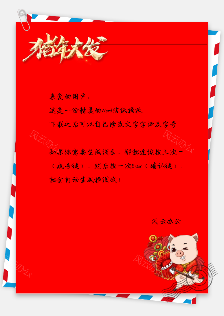 风云办公提供猪年小猪信纸Word模板下载,格式为 docx,一共1页,作品中文字及图均可以修改和编辑,图片更改请在作品中右键图片并更换,文字修改请直接点击文字进行修改。更多精彩信纸Word模板,尽在风云办公。