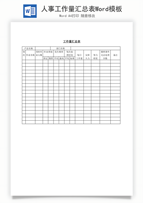 风云办公提供人事工作量汇总表Word模板下载,格式为 word,一共1页,作品中文字及图均可以修改和编辑,图片更改请在作品中右键图片并更换,文字修改请直接点击文字进行修改。更多精彩人力资源Word模板,尽在风云办公。