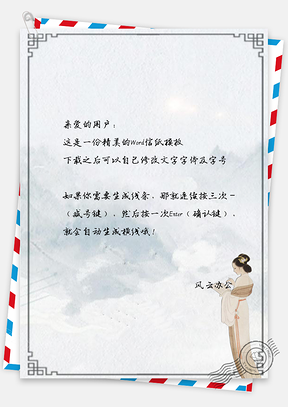 风云办公提供中国风古风女子看花信纸Word模板下载,格式为 docx,一共1页,作品中文字及图均可以修改和编辑,图片更改请在作品中右键图片并更换,文字修改请直接点击文字进行修改。更多精彩信纸Word模板,尽在风云办公。