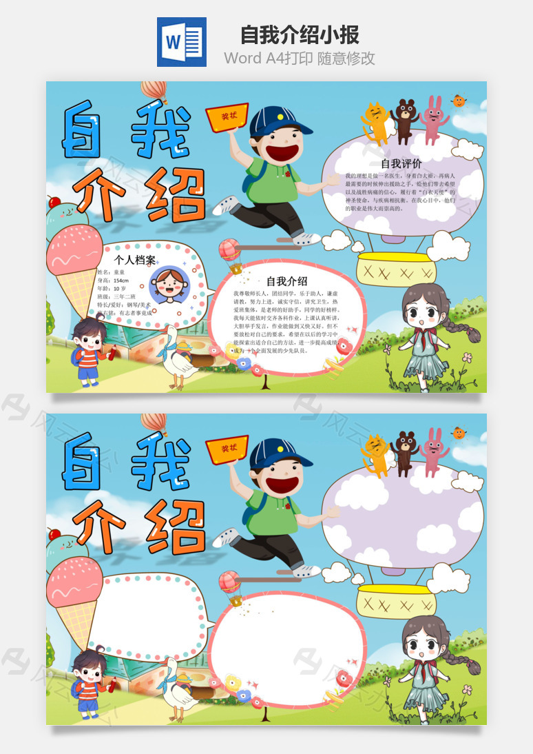 风云办公提供儿童风自我介绍小报手抄报Word模板下载,格式为 ,一共1页,作品中文字及图均可以修改和编辑,图片更改请在作品中右键图片并更换,文字修改请直接点击文字进行修改。更多精彩手抄报/小报Word模板,尽在风云办公。