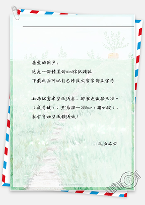 风云办公提供手绘草坪信纸Word模板下载,格式为 docx,一共1页,作品中文字及图均可以修改和编辑,图片更改请在作品中右键图片并更换,文字修改请直接点击文字进行修改。更多精彩信纸Word模板,尽在风云办公。