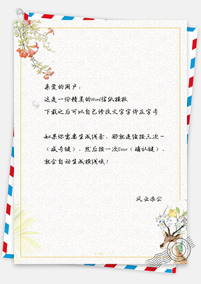 风云办公提供小清新手绘小鹿信纸Word模板下载,格式为 docx,一共1页,作品中文字及图均可以修改和编辑,图片更改请在作品中右键图片并更换,文字修改请直接点击文字进行修改。更多精彩信纸Word模板,尽在风云办公。