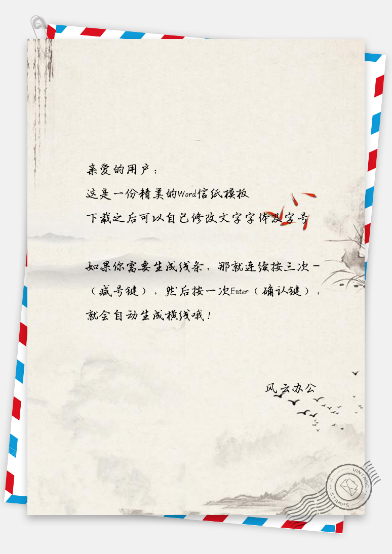 信纸水墨手绘复古中国风风景Word模板