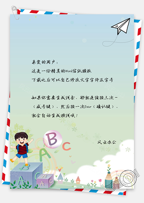 风云办公提供小清新卡通儿童户外信纸Word模板下载,格式为 docx,一共1页,作品中文字及图均可以修改和编辑,图片更改请在作品中右键图片并更换,文字修改请直接点击文字进行修改。更多精彩信纸Word模板,尽在风云办公。