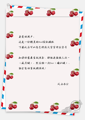 风云办公提供小清新两个樱桃信纸Word模板下载,格式为 docx,一共1页,作品中文字及图均可以修改和编辑,图片更改请在作品中右键图片并更换,文字修改请直接点击文字进行修改。更多精彩信纸Word模板,尽在风云办公。