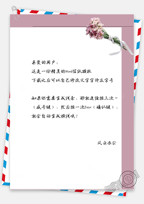 风云办公提供手绘花束信纸Word模板下载,格式为 docx,一共1页,作品中文字及图均可以修改和编辑,图片更改请在作品中右键图片并更换,文字修改请直接点击文字进行修改。更多精彩信纸Word模板,尽在风云办公。