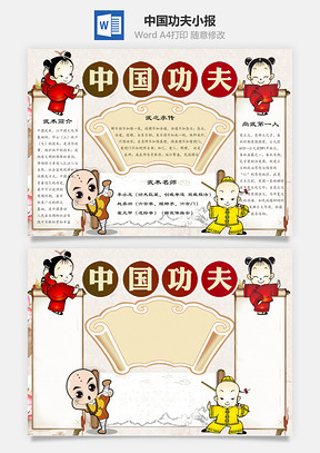 风云办公提供中国功夫小报Word模板下载,格式为 docx,一共1页,作品中文字及图均可以修改和编辑,图片更改请在作品中右键图片并更换,文字修改请直接点击文字进行修改。更多精彩体育手抄报Word模板,尽在风云办公。
