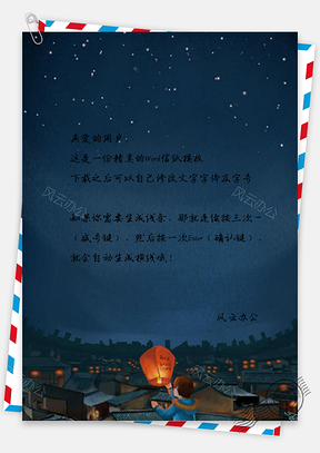 风云办公提供信纸星空孔明灯春运设计Word模板下载,格式为 docx,一共1页,作品中文字及图均可以修改和编辑,图片更改请在作品中右键图片并更换,文字修改请直接点击文字进行修改。更多精彩信纸Word模板,尽在风云办公。