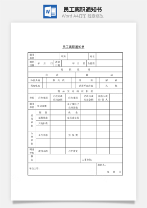 风云办公提供员工离职通知书Word模板下载,格式为 word,一共1页,作品中文字及图均可以修改和编辑,图片更改请在作品中右键图片并更换,文字修改请直接点击文字进行修改。更多精彩人力资源Word模板,尽在风云办公。