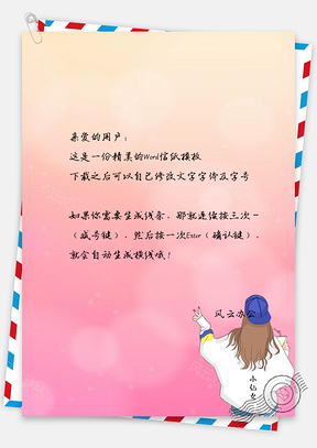 风云办公提供小清新粉色看书女孩信纸Word模板下载,格式为 docx,一共1页,作品中文字及图均可以修改和编辑,图片更改请在作品中右键图片并更换,文字修改请直接点击文字进行修改。更多精彩信纸Word模板,尽在风云办公。