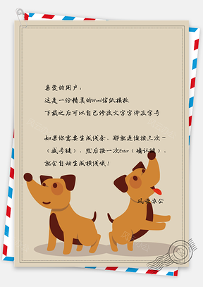 风云办公提供卡通可爱的小狗狗信纸Word模板下载,格式为 docx,一共1页,作品中文字及图均可以修改和编辑,图片更改请在作品中右键图片并更换,文字修改请直接点击文字进行修改。更多精彩信纸Word模板,尽在风云办公。