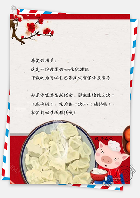 风云办公提供信纸猪年冬至水饺元旦Word模板下载,格式为 docx,一共1页,作品中文字及图均可以修改和编辑,图片更改请在作品中右键图片并更换,文字修改请直接点击文字进行修改。更多精彩信纸Word模板,尽在风云办公。