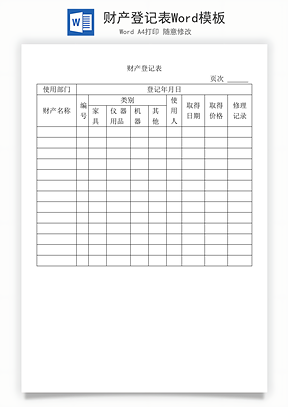 风云办公提供财产登记表Word模板下载,格式为 word,一共1页,作品中文字及图均可以修改和编辑,图片更改请在作品中右键图片并更换,文字修改请直接点击文字进行修改。更多精彩财务管理Word模板,尽在风云办公。