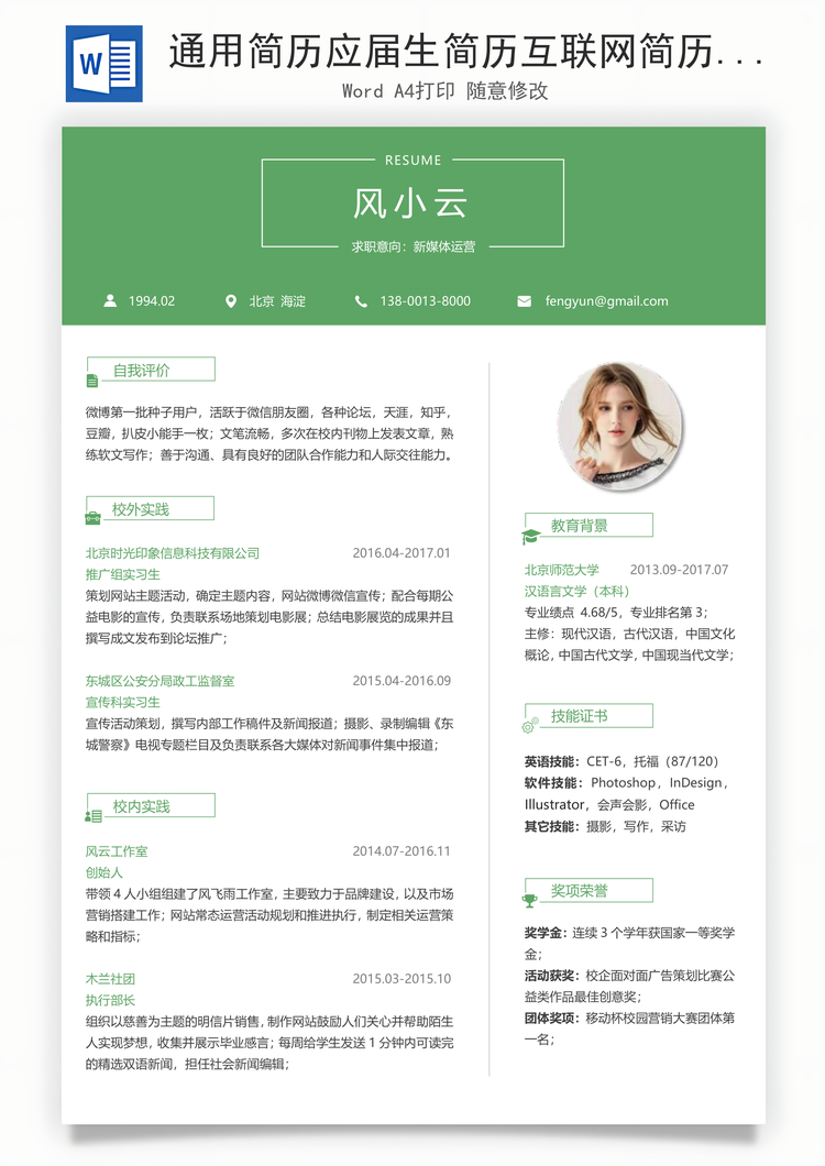 风云办公提供通用简历应届生简历互联网简历个性简历简约简历Word模板下载,格式为 docx,一共1页,作品中文字及图均可以修改和编辑,图片更改请在作品中右键图片并更换,文字修改请直接点击文字进行修改。更多精彩应届生简历Word模板,尽在风云办公。