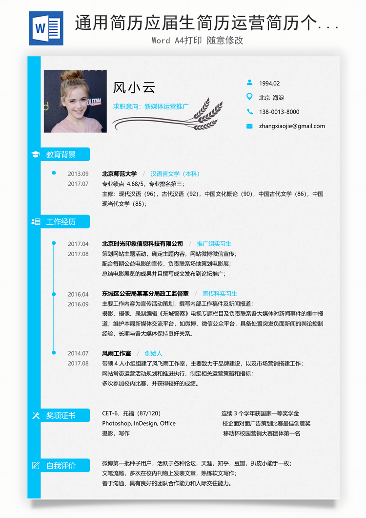 风云办公提供通用简历应届生简历运营简历个性简历创意简历Word模板下载,格式为 docx,一共1页,作品中文字及图均可以修改和编辑,图片更改请在作品中右键图片并更换,文字修改请直接点击文字进行修改。更多精彩应届生简历Word模板,尽在风云办公。