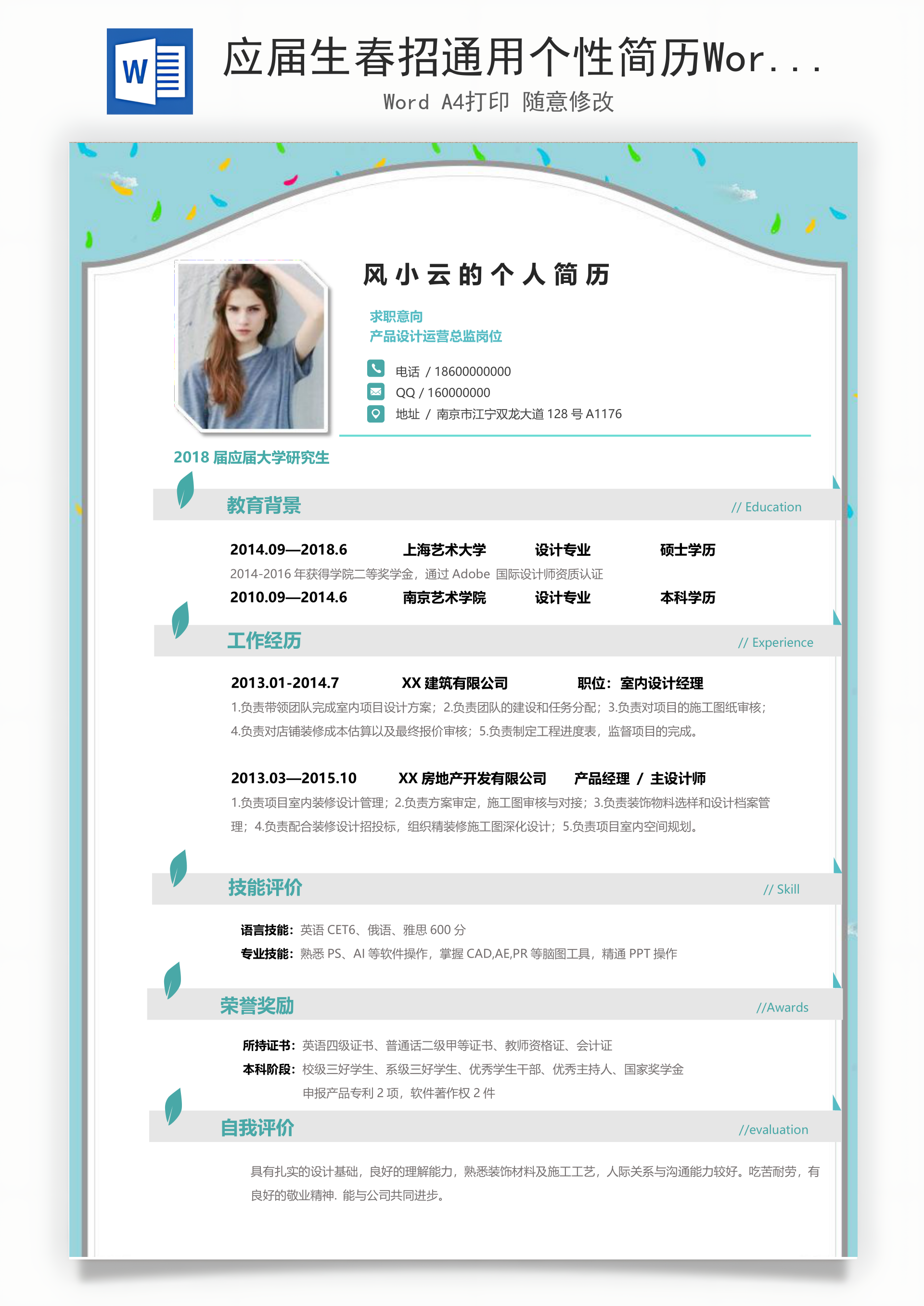 风云办公提供应届生春招通用个性简历Word模板下载,格式为 docx,一共1页,作品中文字及图均可以修改和编辑,图片更改请在作品中右键图片并更换,文字修改请直接点击文字进行修改。更多精彩春招简历Word模板,尽在风云办公。
