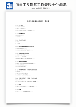 风云办公提供向员工反馈其工作表现十个步骤Word模板下载,格式为 word,一共1页,作品中文字及图均可以修改和编辑,图片更改请在作品中右键图片并更换,文字修改请直接点击文字进行修改。更多精彩人力资源Word模板,尽在风云办公。