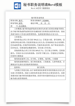 风云办公提供职务分配表Word模板下载,格式为 word,一共1页,作品中文字及图均可以修改和编辑,图片更改请在作品中右键图片并更换,文字修改请直接点击文字进行修改。更多精彩人力资源Word模板,尽在风云办公。
