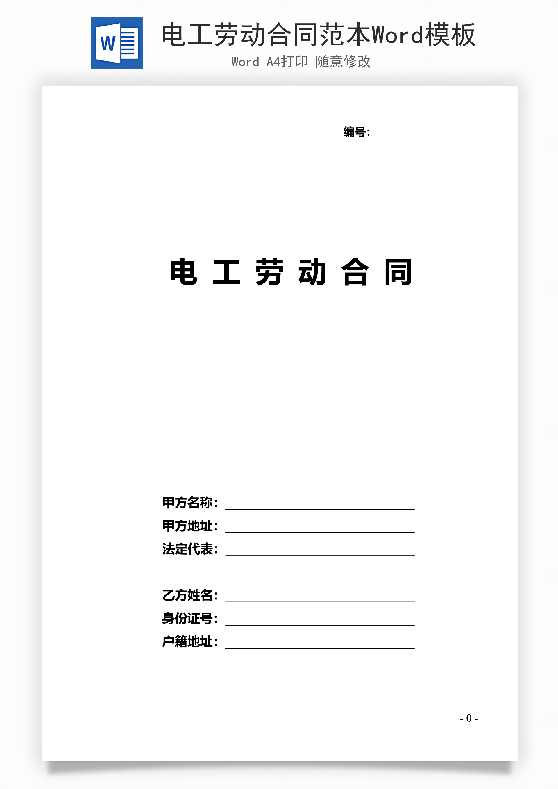 风云办公提供电工劳动合同范本Word模板下载,格式为 doc,一共3页,作品中文字及图均可以修改和编辑,图片更改请在作品中右键图片并更换,文字修改请直接点击文字进行修改。更多精彩合同协议Word模板,尽在风云办公。