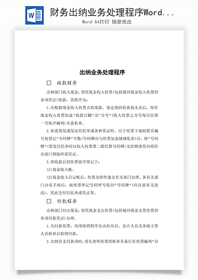 风云办公提供出纳业务处理程序Word模板下载,格式为 word,一共1页,作品中文字及图均可以修改和编辑,图片更改请在作品中右键图片并更换,文字修改请直接点击文字进行修改。更多精彩财务管理Word模板,尽在风云办公。