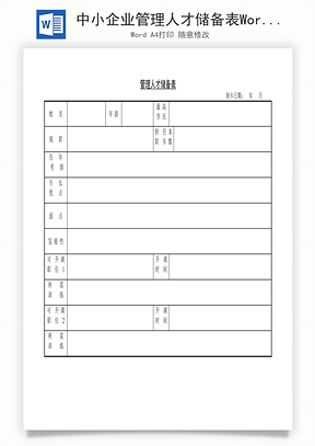 风云办公提供管理人才储备表Word模板下载,格式为 word,一共1页,作品中文字及图均可以修改和编辑,图片更改请在作品中右键图片并更换,文字修改请直接点击文字进行修改。更多精彩人力资源Word模板,尽在风云办公。