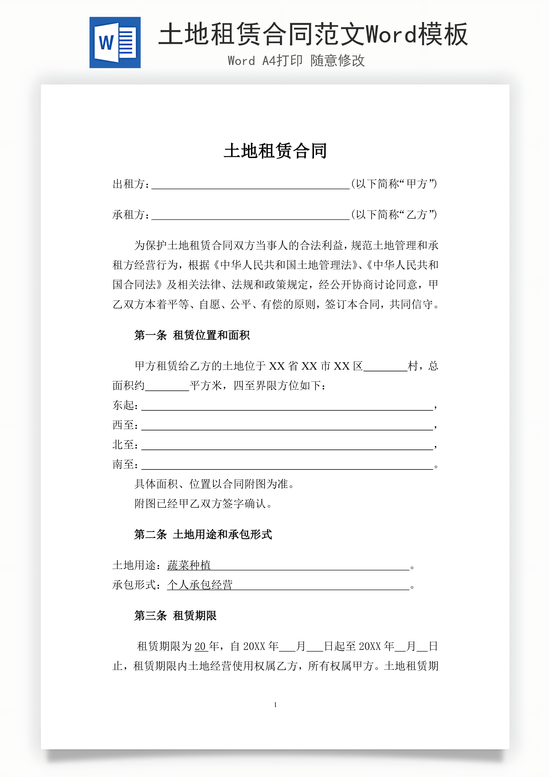 风云办公提供土地租赁合同范文Word模板下载,格式为 docx,一共6页,作品中文字及图均可以修改和编辑,图片更改请在作品中右键图片并更换,文字修改请直接点击文字进行修改。更多精彩合同协议Word模板,尽在风云办公。