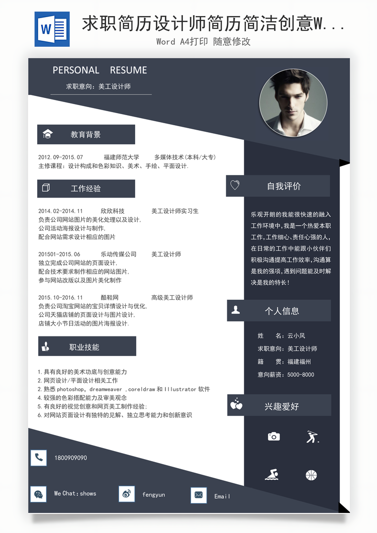 风云办公提供求职简历设计师简历简洁创意Word模板下载,格式为 docx,一共1页,作品中文字及图均可以修改和编辑,图片更改请在作品中右键图片并更换,文字修改请直接点击文字进行修改。更多精彩其它简历Word模板,尽在风云办公。