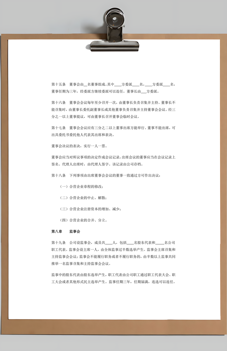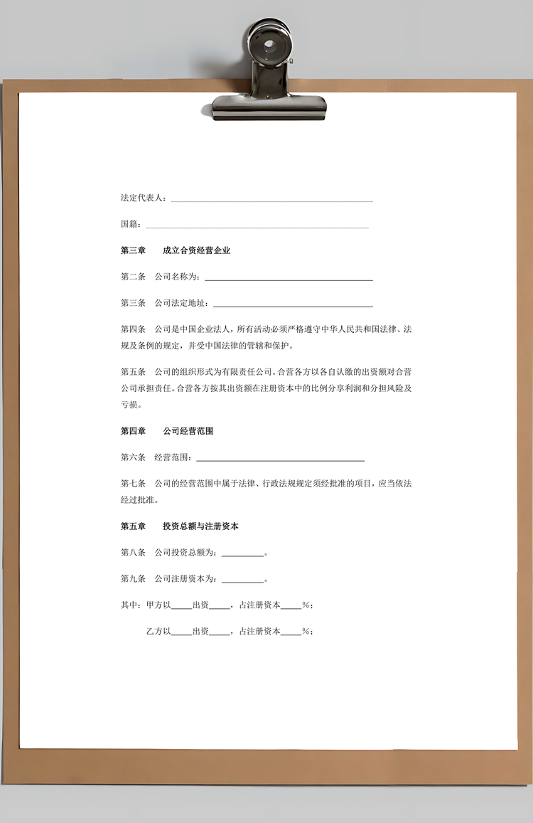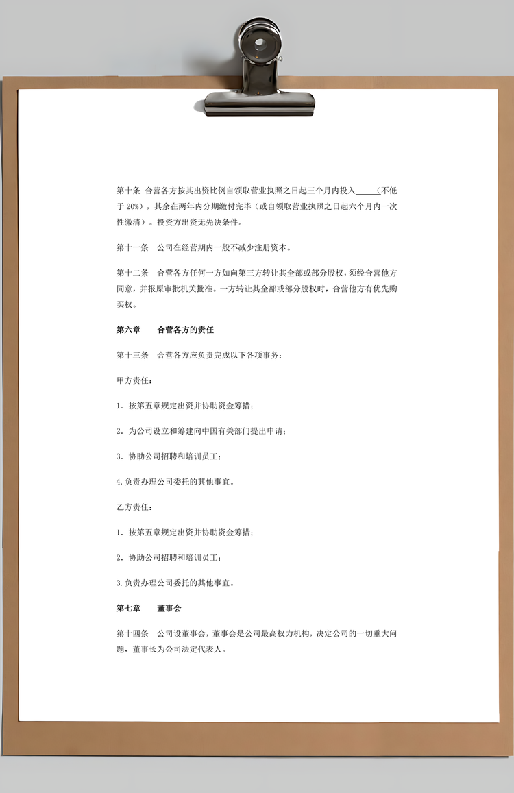 风云办公提供公司合资经营合同Word模板下载,格式为 docx,一共11页,作品中文字及图均可以修改和编辑,图片更改请在作品中右键图片并更换,文字修改请直接点击文字进行修改。更多精彩合同协议Word模板,尽在风云办公。