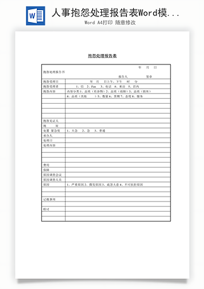 风云办公提供人事抱怨处理报告表Word模板下载,格式为 word,一共1页,作品中文字及图均可以修改和编辑,图片更改请在作品中右键图片并更换,文字修改请直接点击文字进行修改。更多精彩人力资源Word模板,尽在风云办公。