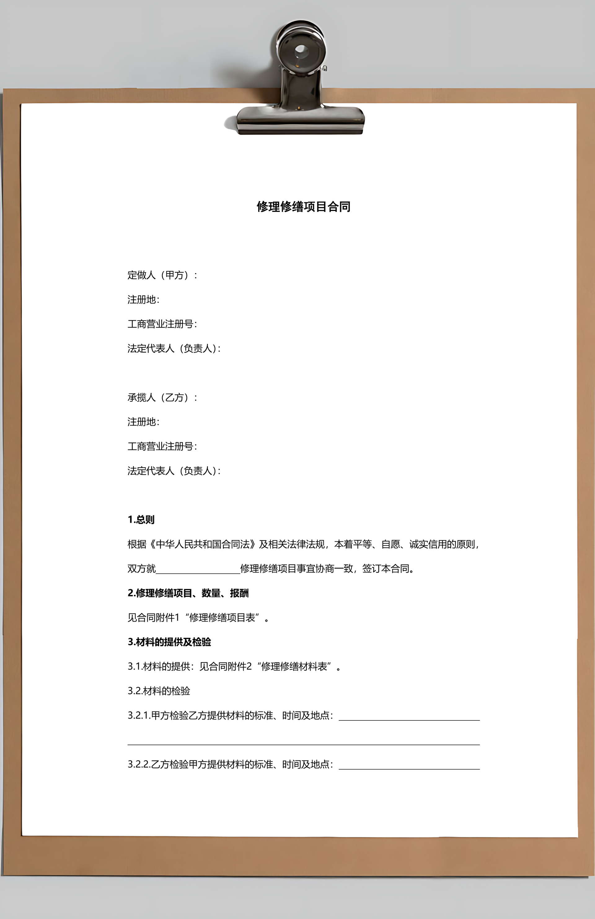 风云办公提供修理修缮项目合同Word模板下载,格式为 docx,一共10页,作品中文字及图均可以修改和编辑,图片更改请在作品中右键图片并更换,文字修改请直接点击文字进行修改。更多精彩合同协议Word模板,尽在风云办公。