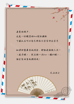 风云办公提供复古信纸落花纸扇简约边框Word模板下载,格式为 docx,一共1页,作品中文字及图均可以修改和编辑,图片更改请在作品中右键图片并更换,文字修改请直接点击文字进行修改。更多精彩信纸Word模板,尽在风云办公。