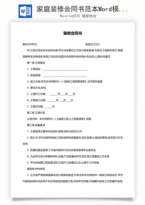 风云办公提供合同协议家庭装修合同Word模板下载,格式为 doc,一共4页,作品中文字及图均可以修改和编辑,图片更改请在作品中右键图片并更换,文字修改请直接点击文字进行修改。更多精彩合同协议Word模板,尽在风云办公。