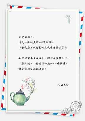 风云办公提供信纸模板文艺小清新Word模板下载,格式为 docx,一共1页,作品中文字及图均可以修改和编辑,图片更改请在作品中右键图片并更换,文字修改请直接点击文字进行修改。更多精彩信纸Word模板,尽在风云办公。
