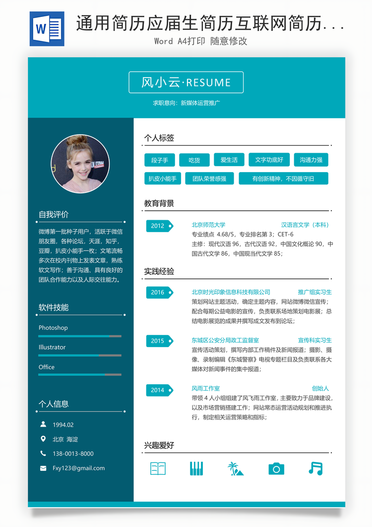 风云办公提供通用简历应届生简历互联网简历个性简历简约简历Word模板下载,格式为 docx,一共1页,作品中文字及图均可以修改和编辑,图片更改请在作品中右键图片并更换,文字修改请直接点击文字进行修改。更多精彩应届生简历Word模板,尽在风云办公。