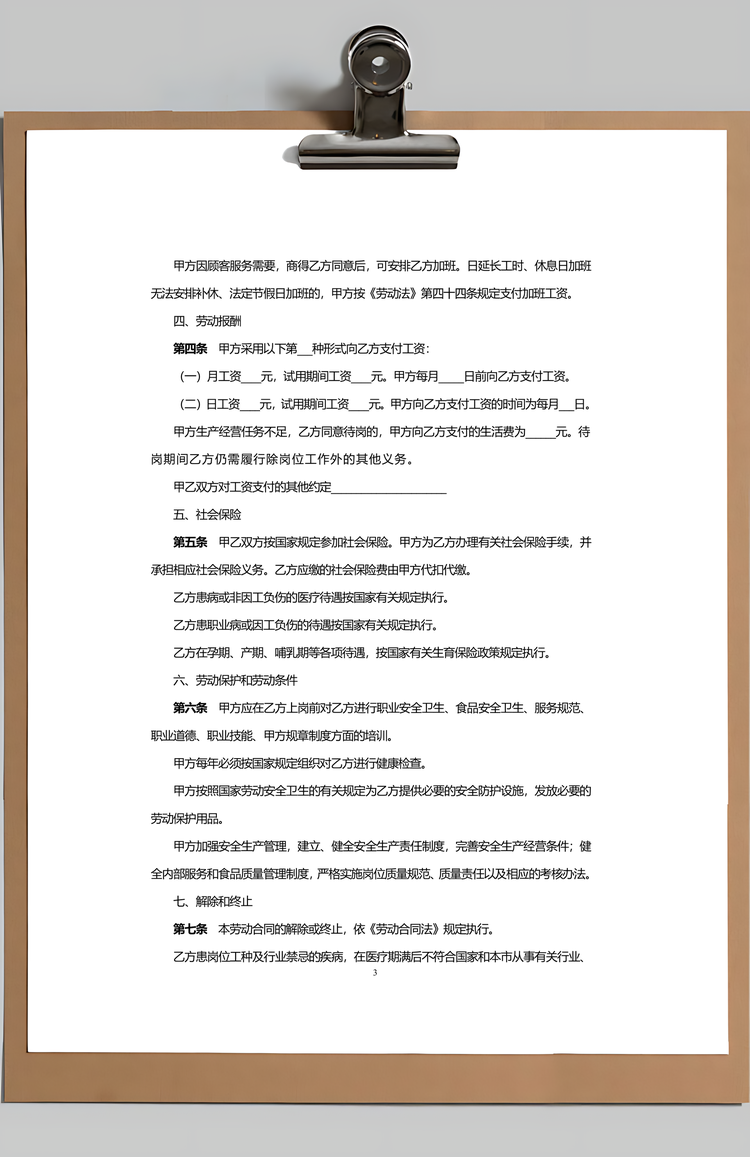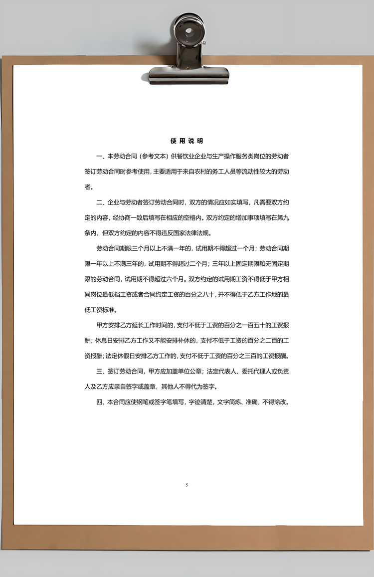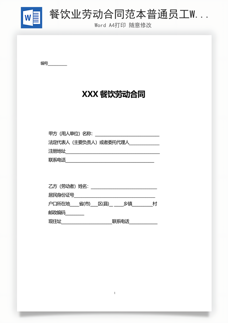 风云办公提供餐饮业劳动合同范本普通员工Word模板下载,格式为 doc,一共5页,作品中文字及图均可以修改和编辑,图片更改请在作品中右键图片并更换,文字修改请直接点击文字进行修改。更多精彩合同协议Word模板,尽在风云办公。