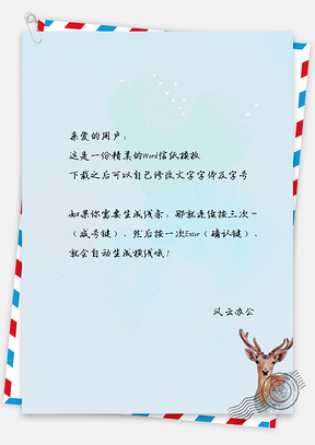 风云办公提供信纸梦幻小清新林深处的鹿Word模板下载,格式为 docx,一共1页,作品中文字及图均可以修改和编辑,图片更改请在作品中右键图片并更换,文字修改请直接点击文字进行修改。更多精彩信纸Word模板,尽在风云办公。